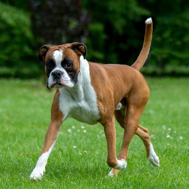 The Boxer is a medium- to large-sized, short-haired working dog developed in Germany from mastiff-type ancestors, originally used to hunt large game such as boar and bear. Recognizable by its square, athletic build, short muzzle, and sleek fawn or brindle coat, the breed combines a powerful physique with a lively, expressive demeanor. Boxers are known for their strong attachment to their families, often displaying a gentle, patient nature with children while remaining alert and protective toward strangers. Highly energetic and intelligent, they thrive on regular exercise, training, and close companionship, making them well-suited to active households that can provide both physical activity and mental engagement.